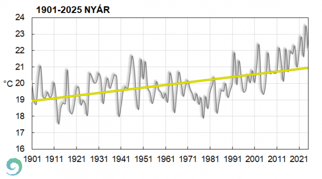 A 2025-ös nyár középhőmérséklete 1,2 °C-kal haladta meg az 1991-2020-as éghajlati normált, és ezzel a 7. legmelegebb nyár lett 1901 óta. Az évszak középhőmérséklete országos átlagban 22,1 °C-nak adódott. Mindhárom hónapról elmondható, hogy melegebb volt a megszokottnál. A június a 2. helyen végzett a megfelelő hónapok rangsorában. A csapadék évszakos mennyisége országosan és helyi szinten is jelentősen elmaradt a sokéves átlagtól. Rendkívül száraz volt a nyár első hónapja, a legszárazabb június volt 1901 óta. A nyár további részében sem javult az aszályhelyzet, július 17%-kal, augusztusban 24%-kal hullott kevesebb a normálnál.