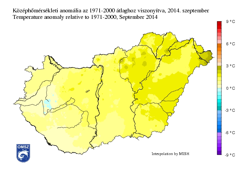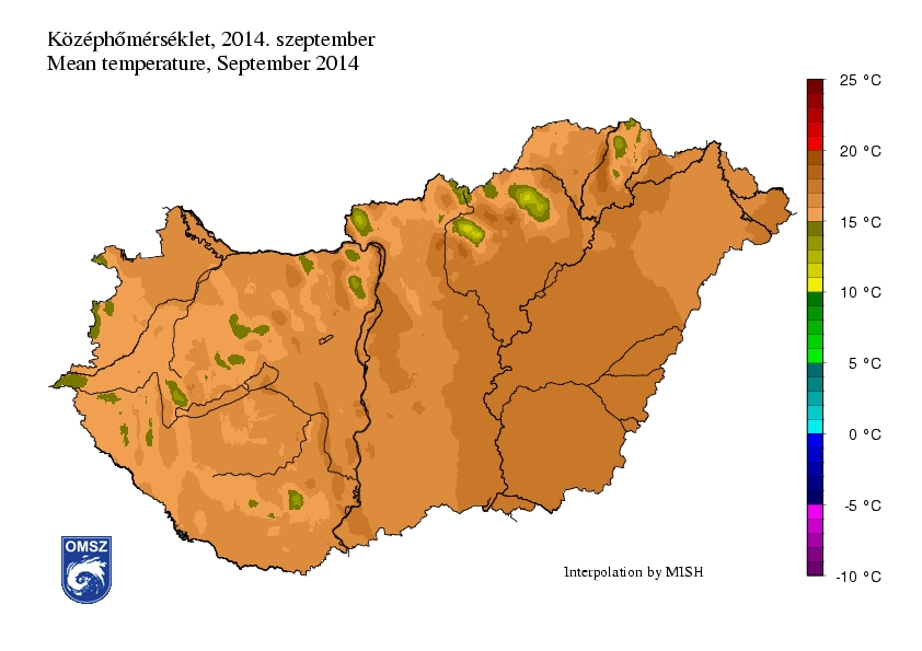 Szeptemberben a havi átlaghőmérséklet az ország legnagyobb részén 16 - 18°C között alakult. Ettől hűvösebb a Dunántúlon volt megfigyelhető (havi átlaghőmérséklet 15-17°C között), a legmagasabb értékek pedig keleten jelentkeztek (18°C körül). Hűvösebb csak a magasabban fekvő területeken volt (11-15°C). Budapest belterületen jegyeztük a legmagasabb átlagot (18,3 °C), a leghidegebb Kékestetőn volt (12 °C).