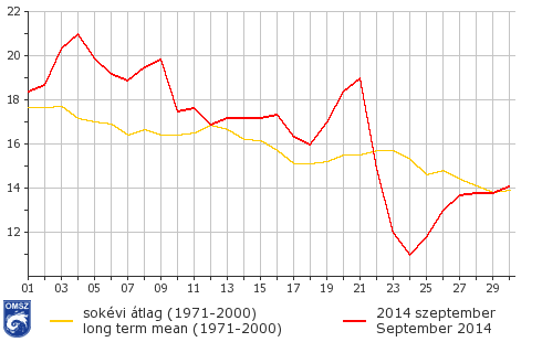 A hónap nagy részén melegebb volt, mint általában. Csak a hónap végén történt változás. Egy intenzív hidegfront hatására lehűlt a levegő. Szeptember 3-án megdőlt a minimumhőmérsékletek sokéves napi maximuma 21,4 °C –kal Egerben. A legmelegebb nap szeptember 4-e volt, ekkor Milotán 23,3 °C –ot, Kékestetőn 15,1 °C-ot mértünk. Az országos átlag 20,7 °C volt ugyanezen a napon. A szeptember 23-án áthaladt gyors mozgású hidegfront hatására 24-én 10,8 °C – ra hűlt le a levegő. A legmagasabb átlaghőmérséklet Siófokon (13,8 °C), a legalacsonyabb Kékestetőn (5,4 °C) volt ezen a napon.