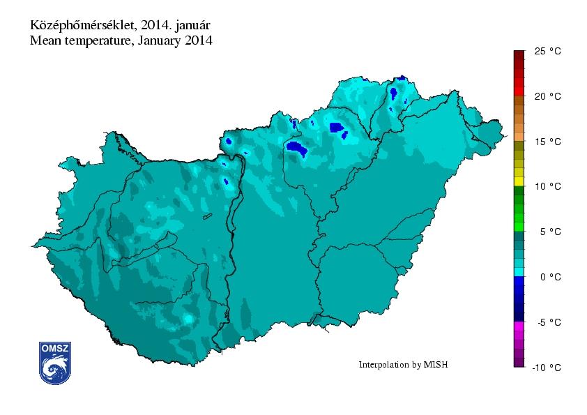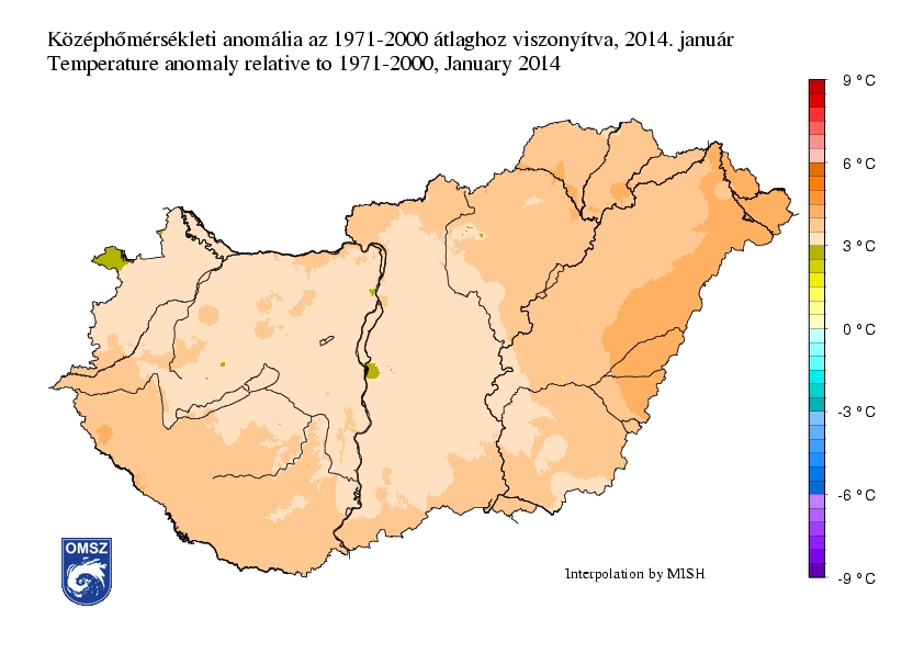 2014 januárja jelentősen melegebbnek bizonyult a megszokottnál: az ország legnagyobb részén a havi átlaghőmérséklet a sokéves normálnál 3-4°C-kal is magasabbnak adódott. A K-i határszélen alakult ki a legnagyobb anomália, itt átlagban 4-4,5°C-kal is melegebb volt a szokásosnál. Az országban sehol sem volt hűvösebb a harmincéves átlagnál, a legkisebb anomália mértéke is +2,5-3°C. Az interpolált adatok alapján hazánkban az idei volt a 7. legmelegebb január 1901 óta.