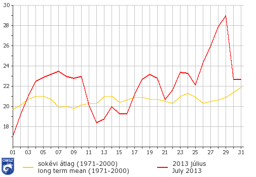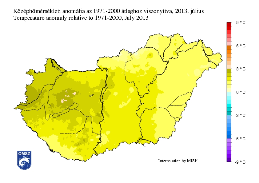 2013 júliusa országos átlagban több mint másfél fokkal melegebbnek bizonyult a megszokottnál. K-Ny irányú anomália-növekedés figyelhető meg az 1971-2000 közötti normálhoz viszonyítva: míg keleten 1 - 1,5°C-kal regisztráltunk magasabb értékeket, addig a nyugati határszélen 2,5-3°C-kal is melegebb volt az ilyenkor szokásosnál. A legnagyobb, 3 fokot is meghaladó eltérés a nyugati országrészben látható Ajka − Zirc környékén.