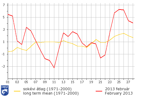 A középhőmérsékleti anomália térképén NY-K irányú növekedést láthatunk: míg a nyugati országrészben az 1971-2000 közötti időszak átlagánál valamelyest (0-1°C-kal) hűvösebb volt jellemző, keleten 2-3°C-kal melegebb volt a megszokottnál. Pátyod környékén még a +3°C-ot is átlépte a hőmérséklet-különbség. Országos átlagban az idei február középhőmérséklete 1,8°C, mely 1 fokkal magasabb az 1971-2000-es normálnál.