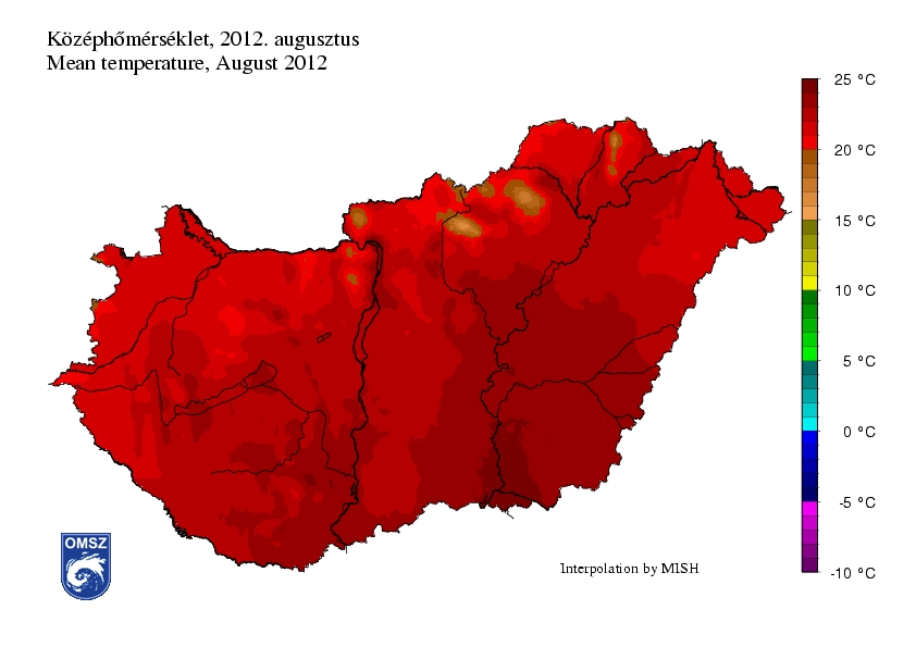 Az idei nyári hónapok tendenciájának megfelelően az augusztus is melegebb volt hazánkban a megszokottnál, a havi átlaghőmérséklet több helyen 3-4 fokkal is meghaladta az 1971-2000-es normál értékét. Szeged, illetve Pécs környékén jegyeztük a legnagyobb középhőmérsékleti anomáliát, ezeken a területeken 4-4,5 °C-kal regisztráltunk magasabb havi átlaghőmérsékletet a megszokottnál.