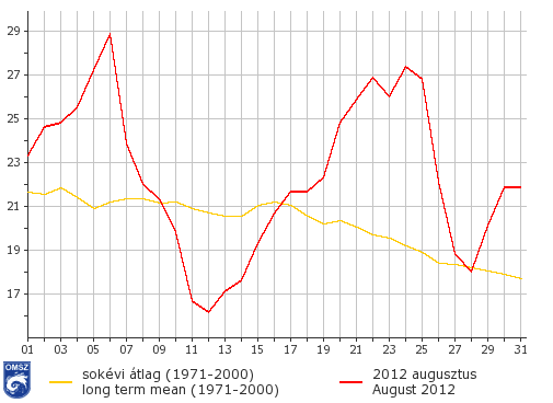 2012 augusztusában az idei nyári hónapokhoz hasonló hőmérsékleti eloszlást figyelhettünk meg, ÉNY-DK irányú átlaghőmérséklet-emelkedés látható. Havi átlagban a legmelegebb ismét Szeged belterületén volt (25,4 °C). A D-i, DK-i területeken 23-24 °C között alakult a havi átlaghőmérséklet, az ország középső területein pedig 22-23 °C közötti ez az érték. Az északi részeken átlagosan 21-22 °C volt jellemző, ettől hűvösebb csak a magasabban fekvő területeken volt, Kékestető állomásunkon 17,7 °C-os átlaghőmérsékletet regisztráltunk. Két hőhullámról is beszámolhatunk a hónapban, melynek köszönhetően több hőmérsékleti rekord is megdőlt. Augusztus 24-én Baja Csávoly állomásunkon 40,4 °C-os napi maximumhőmérsékletet mértünk, mely az 1901 óta feljegyzett értékek között új napi rekord (korábbi rekord: Bugac, 2011, 39,1 °C). Egyéb rekordok között a középhőmérséklet sokéves napi maximumát emeljük még ki, mely 4 alkalommal dőlt meg augusztusban (6-án 31,6 °C Pécsett, 23-án 30,8 °C Szegeden, 24-én 31,1 °C szintén Szegeden, 25-én 30,9 °C Pécsett). Ugyanakkor hideg rekord is született, többször megdőlt a hónapban a napi legalacsonyabb minimumhőmérséklet.