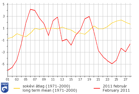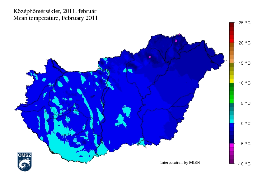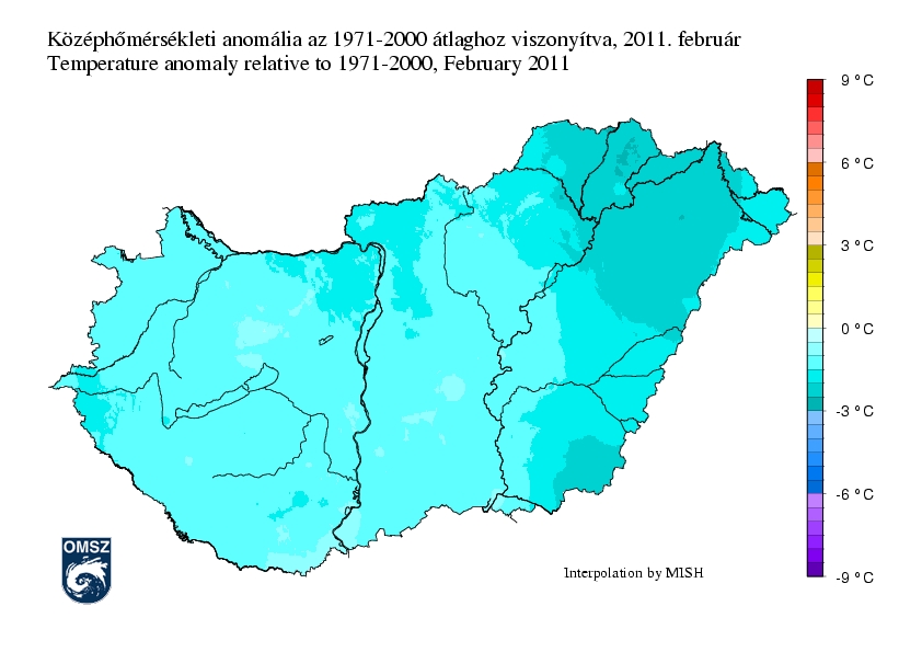 Országszerte hidegebb volt a február a szokásosnál. A legnagyobb, -2 - -3 °C-os eltérések a Tiszántúl északi felében jelentkeztek, míg nyugat felé haladva az anomália értékei 0 °C közelébe kerültek.