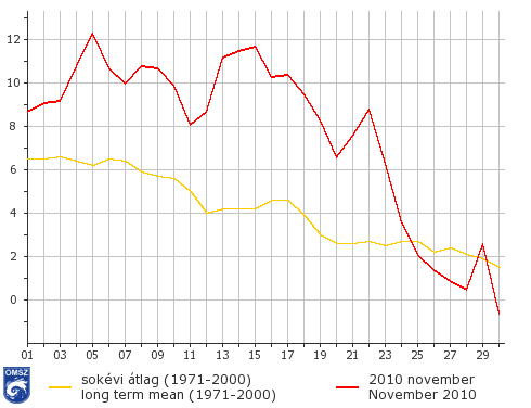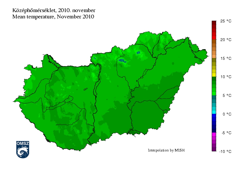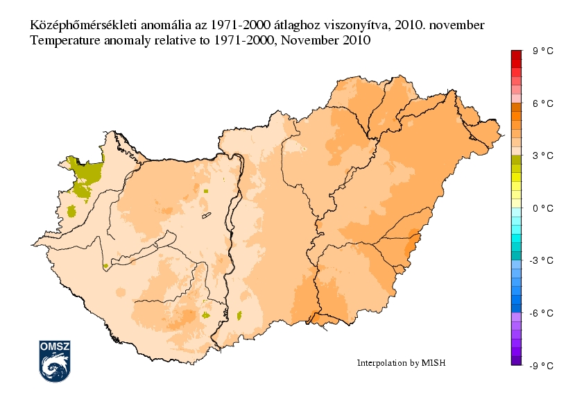 Országszerte több fokkal enyhébb időjárás jellemezte az idei novembert. A legkisebb eltérés, +2-3 °C az ország északnyugati csücskében rajzolódott ki, a nagyobb értékek a keleti országrészben jelentek meg. A tisztán nyugat-keleti elrendeződést a Dunántúli-középhegység és a Mecsek térsége törte csak meg, a Dunántúlon jellemző +3-3,5 °C-os értékek közül a két régió kimagaslott +4 °C körüli értékeivel. A legnagyobb eltérés közel +5 °C volt, mely a Körösök vidékén jelent meg.