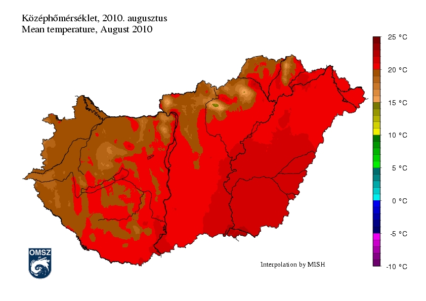 A havi középhőmérséklet augusztusban általában 19 és 22 fok között alakult, mindössze középhegységeink magasabb térségeiben, illetve a nyugati határszélen volt ennél hűvösebb. A legmagasabb átlaghőmérsékletek délkeleten voltak, északkelet felé haladva egyre alacsonyabb átlaghőmérsékletek adódtak.