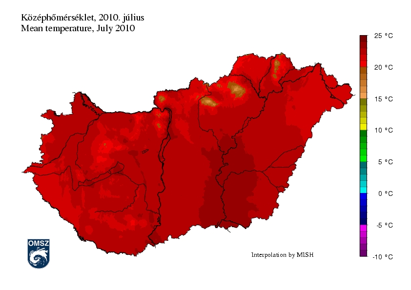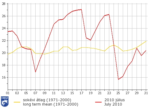 Bár a hónap első napjaiban a szokásosnál melegebb volt, a 2-án kezdődött lassú lehűlés következtében a napi középhőmérséklet országos átlaga 4-én már a sokévi átlag alá csökkent. A hűvös periódus csúcspontja 7-én volt, ekkor mintegy 3 fokkal volt hidegebb, mint ahogy az ilyenkor megszokott. Ezt követően jelentős melegedés vette kezdetét. A hónap nagy részében a sokévi átlagot jóval meghaladó átlaghőmérséklet volt jellemző. A meleg periódus két csúcsa 17-én és 23-án volt, amikor a pozitív anomália elérte a 6, illetve az 5 fokot. Július 23-a után drasztikusan megváltozott a hőmérsékleti kép. 25-én országos átlagban a középhőmérséklet már 5 fokkal elmaradt az ilyenkor szokásos értéktől. A hónap hátralévő napjain bár lassú melegedés kezdődött, az átlaghőmérsékletek rendre elmaradtak a sokévi átlagtól.