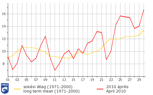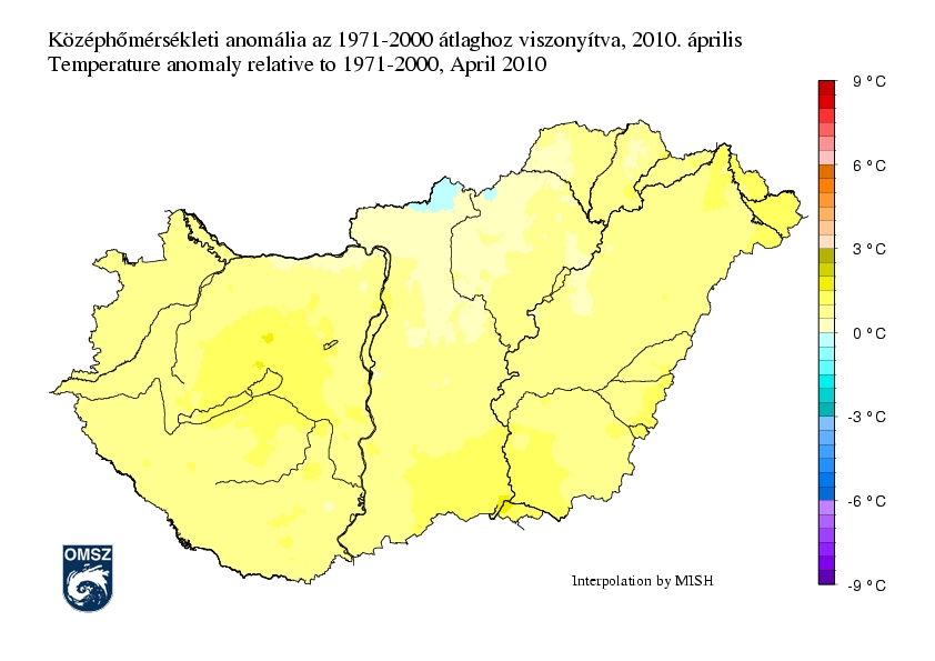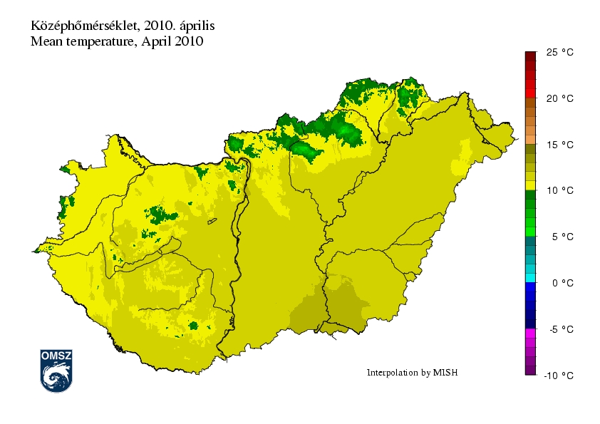 Áprilisban a havi középhőmérsékletek általában 10 és 12 fok között alakultak, ennél alacsonyabb értékek csak az Északi-középhegység és a Bakony magasabb térségeiben fordultak elő. A Fővárosban, Szeged térségében, valamint a Mecsek déli előterében ugyanakkor ennél kissé melegebb volt, itt a havi középhőmérséklet megközelítette a 13 fokot.