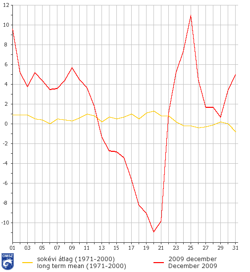 Az országos napi középhőmérséklet nagyon szélsőségesen alakult decemberben. A hónap első harmadában az átlagnál több fokkal melegebb volt, egészen 9-éig, amikor a hazánk fölé érkező sarkvidéki eredetű hideg levegő hatására lehűlés kezdődött. A több mint 16°C-os hőmérséklet süllyedést követően 20-án már -10.9 fok volt jellemző. Ez volt a hónap és egyben az év legalacsonyabb napi középhőmérséklete, mintegy -12 °C-kal eltérve a megszokottól. A lehűlést követően, a Kárpát-medencébe érkező délies, igen enyhe áramlások hatására hasonlóan markáns melegedés következett, 5 nap alatt közel 22 fokot emelkedett a hőmérséklet, így karácsony másnapján már 11 °C volt országos átlagban. A felmelegedés időszaka rekordokban bővelkedett: 23-án, 25-én és 26-án is megdőlt a napi jellemző maximumhőmérsékleti rekord. Az újabb lehűlést követően az értékek 29-ére az átlag közelébe kerültek, és az időszak végéig fölötte maradtak.
