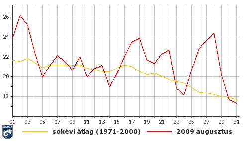 Az ország teljes területén pozitív hőmérsékleti anomália adódott augusztus hónapban. Az országban főként az 1,5 – 2 °C-os eltérés volt a jellemző. A Tisza menti területeken az eltérés mértéke 2 – 2,5 °C közöttinek adódott. Az északi, déli, nyugati határvidékeken a középhőmérséklet 0,5 – 1 fokkal volt a sokévi átlag felett.