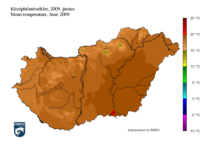 A középhőmérséklet az Alföld nagy részén, +18, +20 fok között alakult. Szeged térségében adódott ettől magasabb érték. Az ország nyugati, északi területein főként 16-18°C közötti havi középhőmérséklet adódott. A középhegységekben fordult csak elő ettől alacsonyabb havi átlagérték.