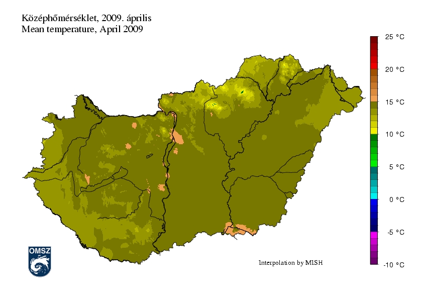 Áprilisban az ország legnagyobb részén 14-15°C közötti középhőmérséklet volt megfigyelhető. Ennél kissé hűvösebb volt a nyugati és az északkeleti határok mentén, valamint a magasabban fekvő területeken. 15-16 °C-os terüleket találhatunk a városhatással terhelt budapesti körzetben, Szeged környékén és néhány elszórt foltban.