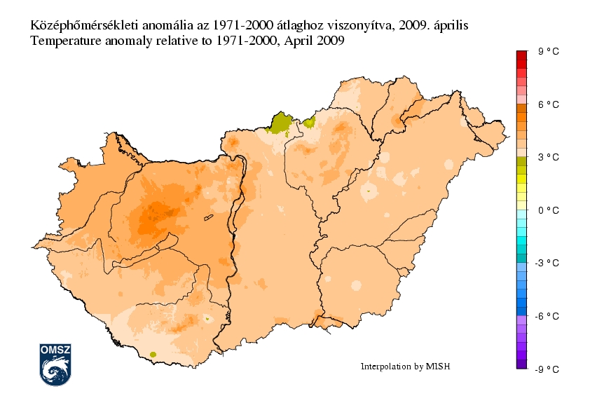 Az ország egész területén sokkal melegebb volt, mint a sokévi átlag. A különbség mindenhol meghaladta a 2 °C-ot, a Dunántúlon elérte a 4 fokot, a Bakony térségében megközelítette a 6 °C-ot is. 2009 áprilisa 1901 óta a legmelegebb április.