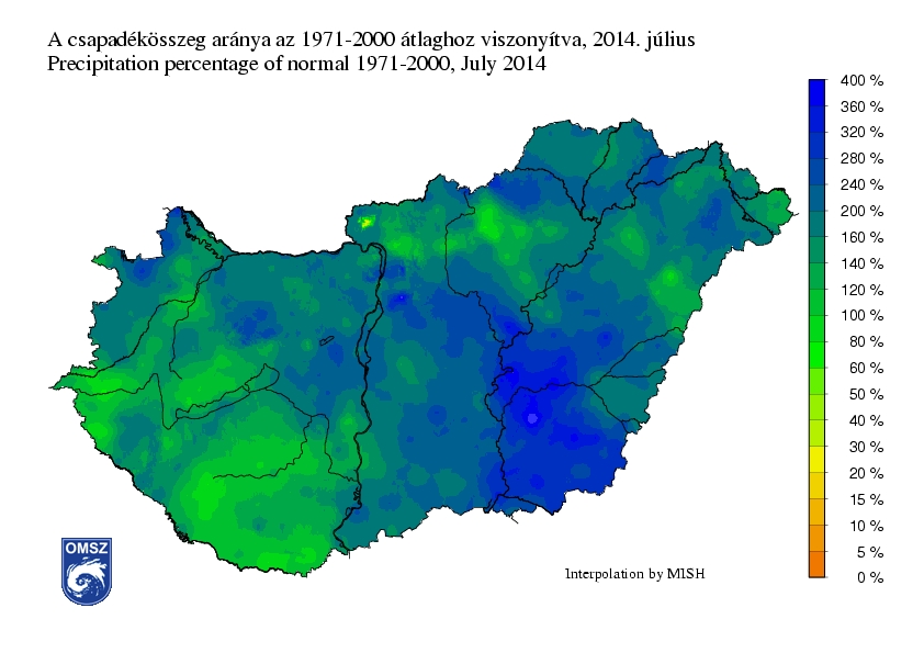 Az egyes területekre számított 1971-2000-es átlagokhoz képest a legnagyobb csapadéktöbbletek a DK-i országrészben jelentkeztek, itt a megszokott mennyiségnek nem ritkán a háromszorosa-négyszerese is lehullott. Az északi országrészben és DNy-on jelennek meg alacsonyabb értékek a 2. ábrán, itt a normál 80-140%-ával számolhatunk.