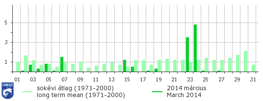 A hőmérsékletcsökkenést okozó frontrendszer március 23-24-én eredményezett nagyobb mennyiségű csapadékot, a legnagyobb napi csapadékösszegek is erre az időszakra tehetők. A legtöbb csapadék 23-án Sopron Kuruc-dombon (13,7 mm), másnap Szeged belterületén (21,9 mm) hullott. Március hónap folyamán 14 napon mértünk csapadékot.