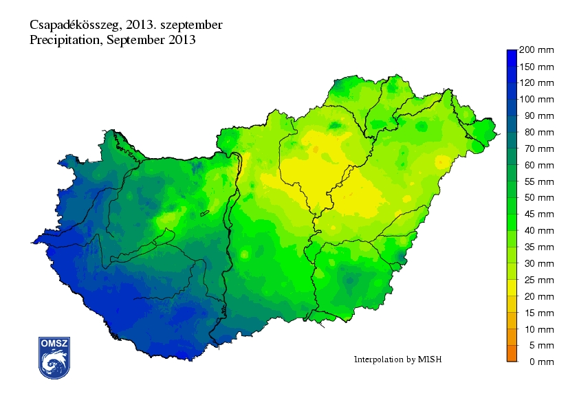 A szeptember havi csapadékösszeget tekintve térben igen nagy különbségek jelentkeztek. Hazánk nyugati-délnyugati felében nagy értékek adódtak, 70-120 mm közötti havi összegeket mértünk, míg a sárgával színezett területeken (Heves és Jász-Nagykun-Szolnok megye, valamint a főváros térsége) csupán 20-25 mm eső hullott. Az ország többi részén jellemzően 25-50 mm közötti mennyiségeket regisztráltunk.