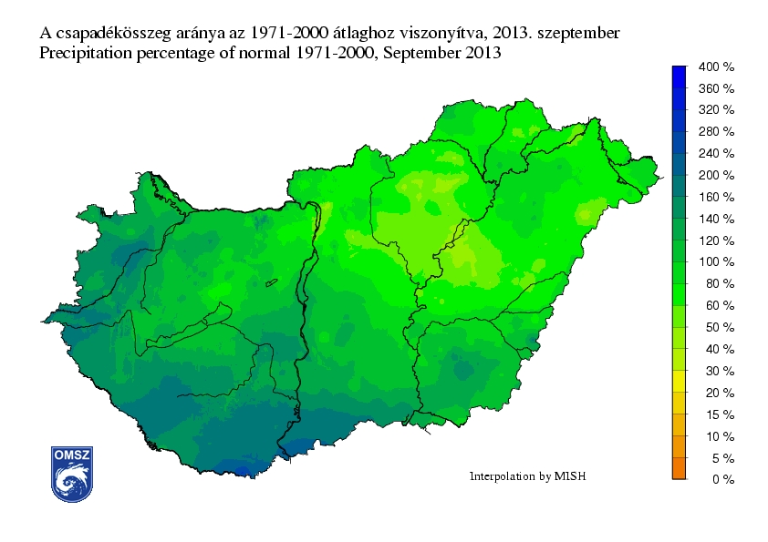 A csapadékanomáliát tekintve – a nyári nagy szárazság után végre – az idei szeptemberi összeg kevéssel a sokévi átlag felett alakult országos átlagban. A nyugati-délnyugati területeken csapadéktöbblet jelentkezett, itt a normál 120-200%-a volt jellemző (sőt a déli határszélen 200-280% közötti arány is előfordult), az ország északkeleti felében azonban elmaradtak az idei értékek a normáltól, csupán 40-80%-a hullott a sokévi átlagnak.