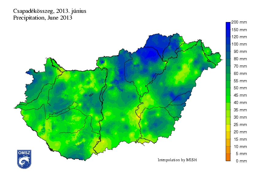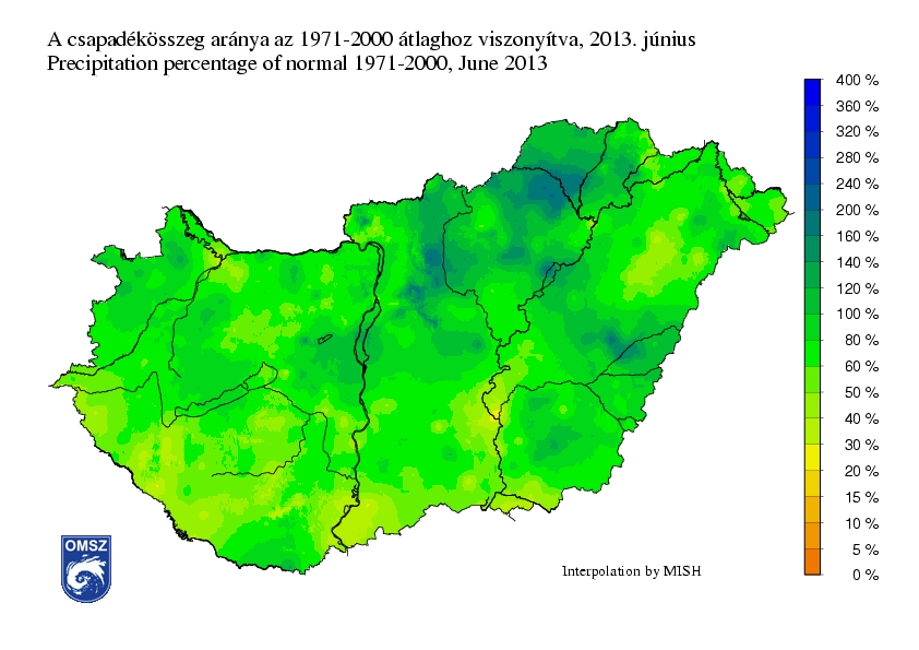 A sokéves átlaghoz viszonyítva a 2013 júniusában lehullott csapadékmennyiségek zömmel DNy-ÉK irányú növekedést mutatnak az ország területén. Hazánk túlnyomó részén a megszokott csapadékmennyiség 60-90%-a hullott le; DNy-on 30-50%, ÉK-en pedig 160-240% közötti ez az érték. Országos átlagban hozzávetőleg 11%-kal kevesebb csapadék hullott idén júniusban a megszokottnál.