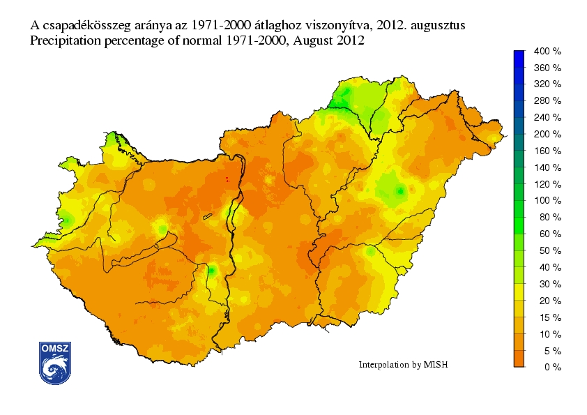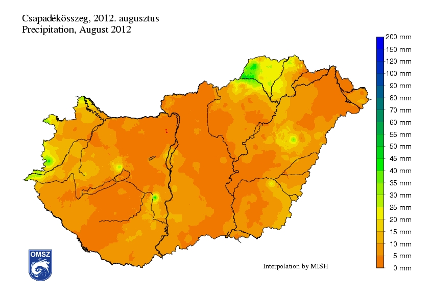 Az idei augusztus rendkívül száraznak bizonyult, az ország jelentős részén gyakorlatilag szinte nem esett eső a hónapban; a csapadékösszeg a teljes hónapra vonatkozóan a legaszályosabb területeken 0-5, illetve 5-10 mm között alakult. Borsod-Abaúj-Zemplén megye ÉNY-i részén (Szőlősardó és Putnok települések környékén), a nyugati határszélen (Vas megye: Ják, Győr-Moson-Sopron megye: Sopron és Rajka), illetve Bikácsnál (Tolna), Szentkirályszabadján (Veszprém) és Hajdúszoboszlón (Hajdú-Bihar) mértünk ennél nagyobb csapadékösszegeket, itt az értékek 30-60 mm között alakultak.