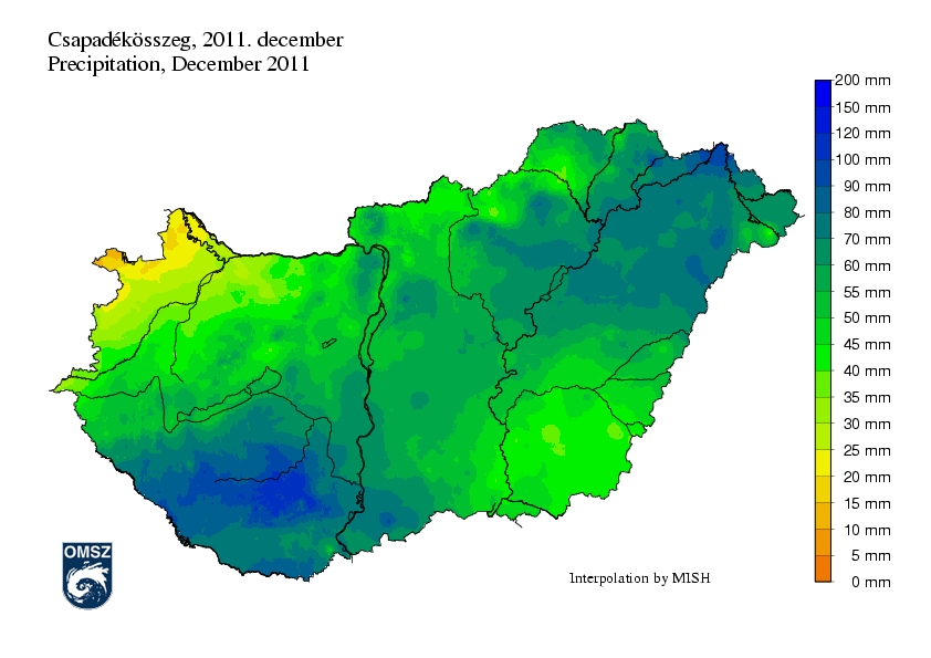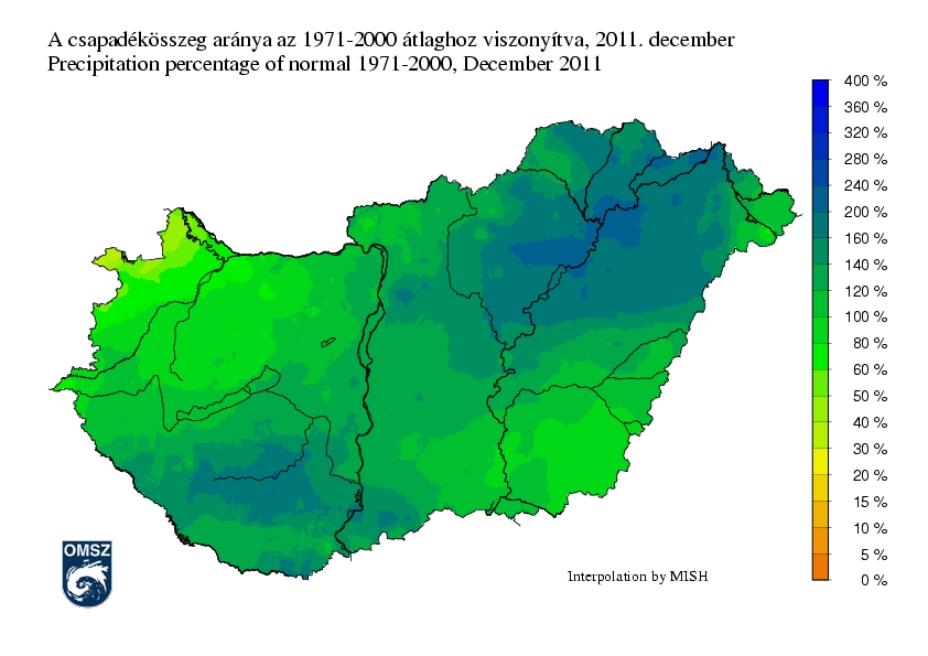 Az év legtöbb hónapjával ellentétben a december viszonylag bőséges csapadékot hozott, az értékek 10 és 130 mm között mozogtak. Csapadékban leggazdagabb a Dél-Dunántúl volt 80 mm fölötti csapadékhozamokkal, de hasonlóan csapadékos területek az északkeleti országrészben is kirajzolódtak. A legszárazabb időjárás hazánk északnyugati csücskét jellemezte, itt az értékek 25 mm alatt maradtak.