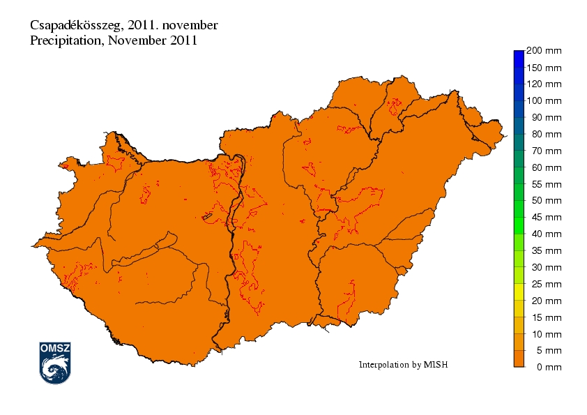 A havi csapadékösszeg rendkívüliségét a csapadéktérkép egyöntetű narancssárga színezete is sejteti. A színnek megfelelően hazánk egész területén 5 mm alatti csapadék hullott, a legtöbb állomás csapadéka az 1 mm-t sem érte el. A szárazságban szinte oázisként jelent meg Újfehértó állomásunk (Szabolcs-Szatmár-Bereg megye) maximumnak számító 4,4 mm-es havi összegével, emellett hasonlóan szerény, de országos viszonylatban mégis kimagasló, 4 mm körüli csapadéknak örvendhettek Baranya megye keleti részében is.