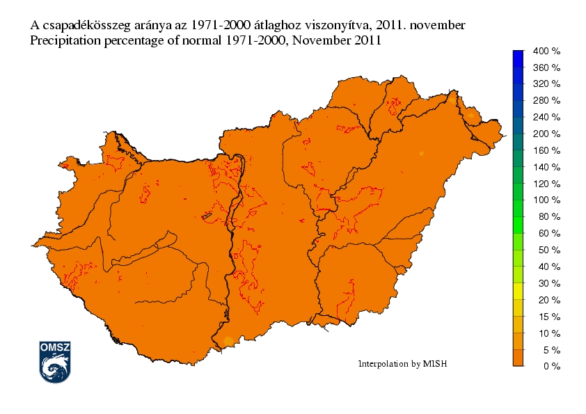 A szélsőséges csapadékhiányt jellemzi a néhány ponttól eltekintve szintén egyszínű anomália térkép. Az eltérő színű pontok a fent említett, néhány milliméteres csapadékot kapott térségekben jelentkeztek. Arányaiban a legnagyobb összeg a sokéves átlag körülbelül 7%-a volt, az ország túlnyomó részén azonban ez az érték 0 és 1% között alakult.