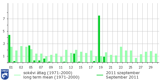 Az országos átlagban vett csapadékösszegek is rendkívül száraz időszakot tükröznek, említésre méltó csapadék csupán három napon hullott. Több nap szinte teljesen száraznak bizonyult, a hónapot kilencnapos csapadékhiányos időszak zárta.