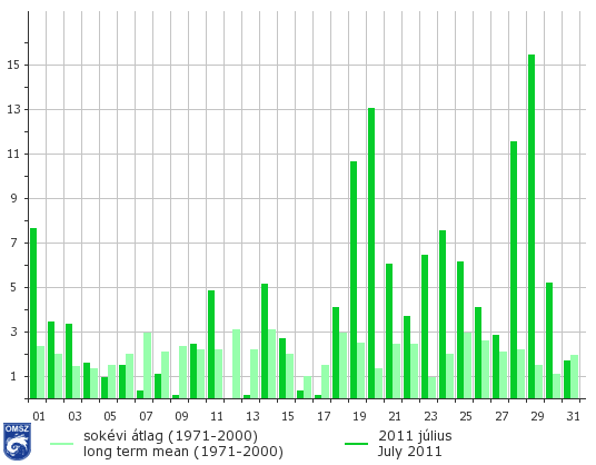 A júliusi havi csapadékösszeg országszerte meghaladta a 30 mm-t. 100 mm fölötti összeg a Dunántúli-középhegység, a Mecsek és a Tiszántúl régióiban esett. A legnagyobb értékek a Tiszántúlon jelentkeztek, helyenként a 180 mm-t is meghaladva.