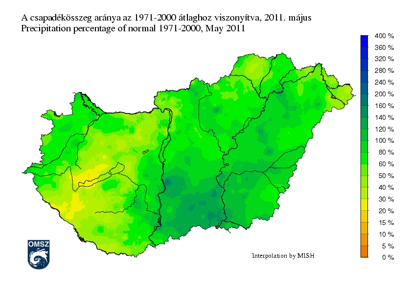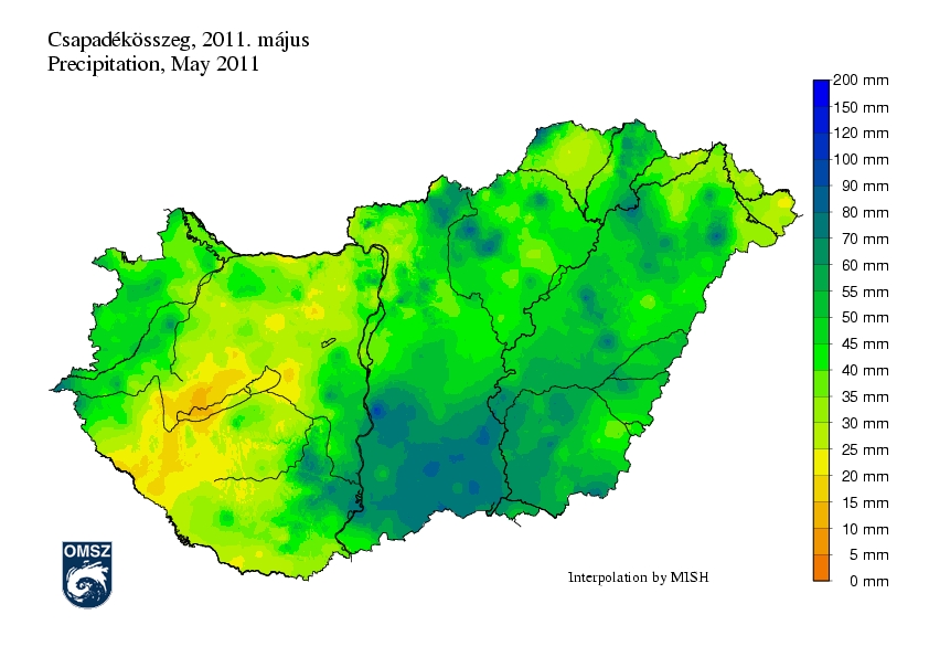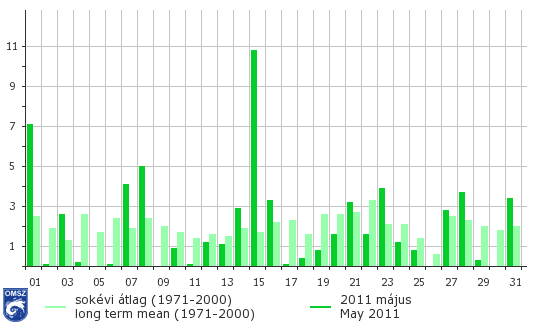 Országos átlagban kiemelkedően sok csapadék május 15-én hullott, a nagy (20 mm fölötti) csapadékösszegek a keleti országrész középső felét érintették. 7 mm-t meghaladó csapadék volt jellemző 1-jén, de az átlagnál csapadékosabb volt a 7-e és a 8-a is. Utóbbi két napon Kékestető állomásunkról hózáporról kaptunk jelentést.