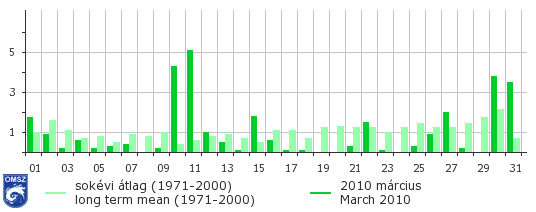 A legcsapadékosabb időszak március 10-11-e volt, amikor a napi csapadékösszeg országos átlagban 4-5 mm volt. A hónap utolsó két napjára esett a másodmaximum, ekkor a napi csapadékösszeg megközelítette a 4 mm-t. A hónap második harmadában több helyről jelentettek havazást, a lehullott hó mennyisége azonban általában nem volt jelentős.