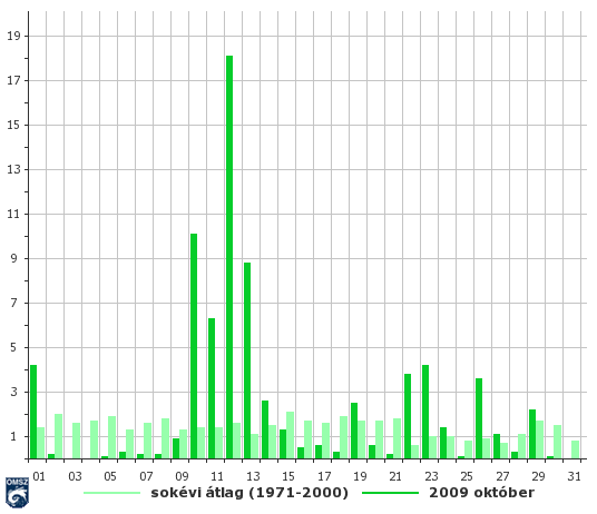 Országos átlagban jelentős mennyiségű napi csapadékösszeg 10-13 között hullott. 18-án az országos átlag közel 18 mm-nek adódott.