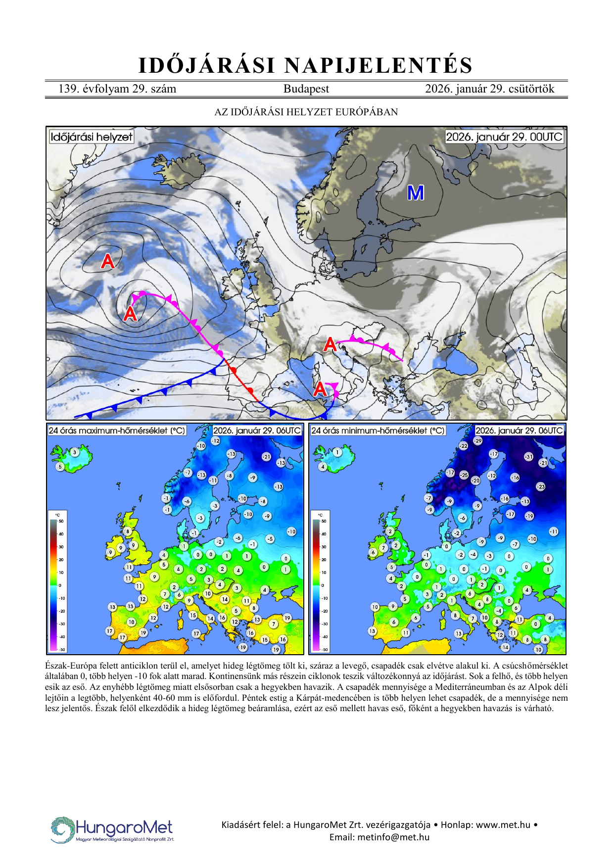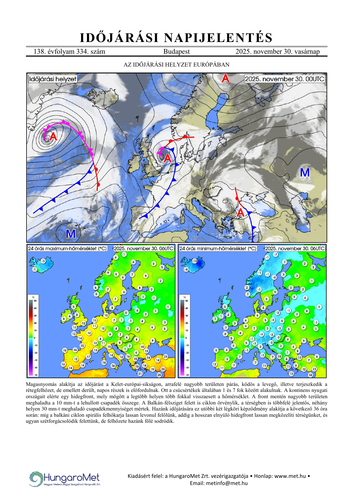 Az európai kitekintés a fronttérkép és a rövid szöveges elemzés mellett bővül a hőmérséklet napi minimum- és maximumértékeit ábrázoló térképekkel.