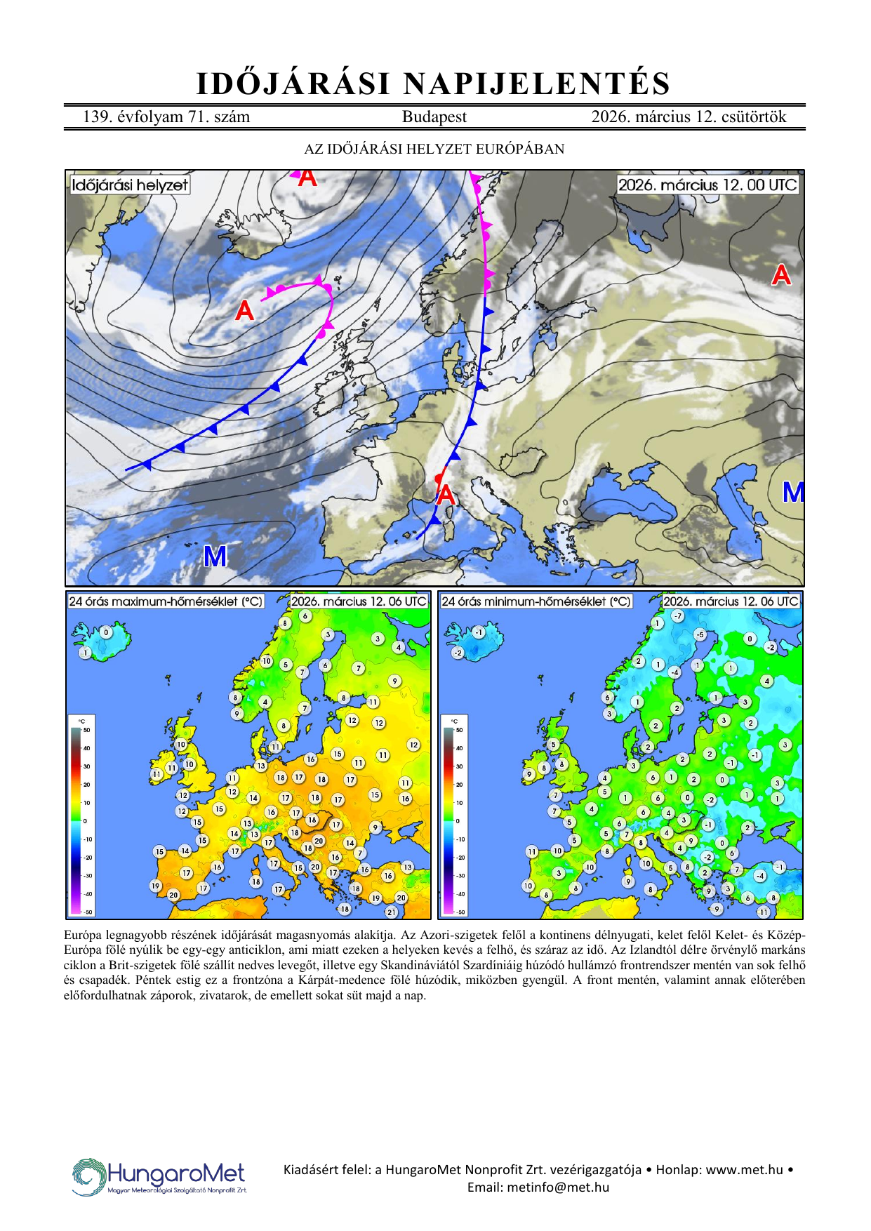 Az európai kitekintés a fronttérkép és a rövid szöveges elemzés mellett bővült a hőmérséklet napi minimum- és maximumértékeit ábrázoló térképekkel.