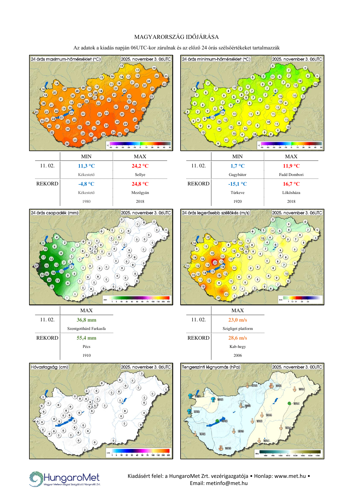 A meteorológiai elemek OMSZ által mért napi értékei ezentúl kontúrtérképeken jelennek meg, de továbbra is tartalmaznak konkrét számértékeket, a korábbinál jóval több állomásról. A térképek alatt táblázatos formában feltüntetjük a napi szélsőértékeket és az abszolút napi rekordadatokat. Az eddigiektől eltérően a napi (24 órás) adatok egységesen, 06 és 06 UTC közötti időszakot fednek le – nagyobb összhangban a nemzetközi gyakorlattal.
