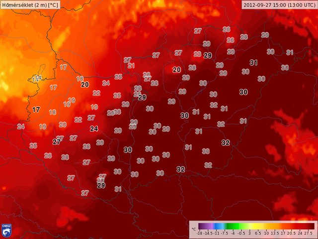 2012 szeptembere - hasonlóan a nyári hónapokhoz - melegebb volt a szokásosnál. A nyárias őszi időszak egyik kiemelkedő napja szeptember 27-én volt. 1901-től kezdődően az OMSZ állomásainak mérései alapján a legmagasabb minimum hőmérséklet eddig 19,8 fok volt (1994, Pécs Árpádtető), ami 20,8 fokra módosult, s ezt Kaposváron mérték. Ugyanakkor a legmagasabb maximum hőmérséklet 32,2 fokról (1942, Túrkeve), 32,6 fokra változott, amelyet Orosházán regisztráltak. Az ország délkeleti tájain másutt is nagyon meleg volt, több helyen (pl.: Körösladány, Pitvaros, Szeged) is 32,3 fokig melegedett a levegő. Az előrejelzések szerint az elkövetkező napokban meleg rekordra nem lehet számítani. |